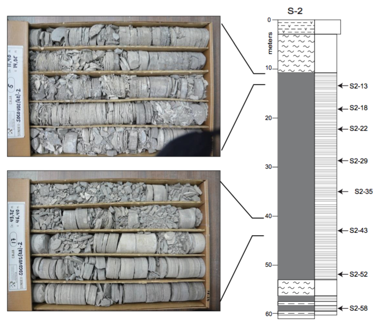 Samples of organic-rich sediments were collected from outcrops and borehole cores available from the study area. In the Cenajo Basin, two stratigraphic sections were described and identified potential organic-rich intervals sampled (Figs. 4; 5). Well cores were sampled in Las Minas de Hellín basin (wells M-1, M-14, M-15 and M-19, Fig. 6) Socovos Basin (wells S-1, S-2, S-3 and S-4; Figs. 7; 8), and Lorca Basin (well L-3). Six of these cores are stored at the Instituto Geológico y Minero de España (IGME) core repository, and two cores are stored at the Faculty of Geology (Univ. Barcelona). The wells correspond to campaigns of sulfur, diatomite and shale-oil mining exploration conducted by IGME and MINERSA company during the past seventies and eighties (Fig. 8). The stratigraphic position of the samples in Las Minas de Hellín and Cenajo basins corresponds to massive and laminated marls interbedded with carbonate bearing sulfur nodules deposited during stage III that overlies the evaporitic deposits of stage II (Elizaga, 1994; Calvo and Elizaga, 1994; Ortí et al., 2014). The stratigraphy of Socovos Basin is poorly exposed and described based on drilling exploration; the studied samples were collected mainly from cores. The Lorca samples come from the Varied Member of Geel (1979) or Tripoli Member (Rouchy, 1982), this unit is 70m thick and is a transitional unit that overlies the Hondo Marl Formation (basinal marls) and underlies the Serrata evaporites. This member consists of marls, diatomic beds and some gypsum layers that alternate with carbonates bearing native sulfur nodules that were commercially exploited during the past century. According the IGME the average total accumulated thickness of organic-rich shales in the Lorca Basin is 2.25m and extends over an area of 11.55Km x 0.62Km (IGME, 1981, 1982).