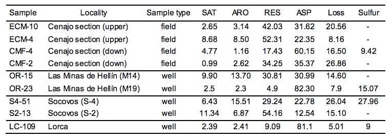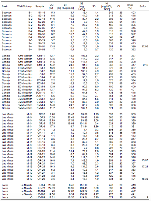 All these organic and mineral characteristics are similar in all investigated basins, and in agreement with those obtained for the Lorca Basin, where TOC reaches 22%, oil potential is up to 200mg HC/g of rock, HI is around 800 and sulfur content between 6 and 16% (Permanyer et al., 1994; Benali et al., 1995).