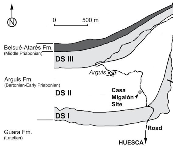 The Arguis Fm. consists mainly of bluish-grey marls and interbedded limestones. Thickness is variable (100-1200m), around 1000m in the Arguis syncline (Arguis area) and represents the Bartonian-early Priabonian time interval based on biostratigraphic and magnetostratigraphic data (Millán et al., 1994; Canudo et al., 1991; Pueyo et al., 2002; Cohen et al., 2013). This formation has been described as a shallow-marine, mixed siliciclastic-carbonate setting; nevertheless, a deltaic component can also be detected and the facies also show significant fluvial influence, including the effects of storms and tides (Castelltort et al., 2003).