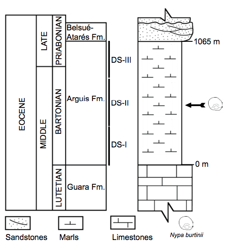 Occurrence.Nypa burtinii is found in Eocene deposits from the Catalan Central Depression (Comarca del Bages), and at the quarry of Balçamuller (Castellgalí) and Can Font Els Comtals (Mal Balç trackway, Manresa) (Álvarez-Ramis, 1982). It also occurs in the Monistrol and Vacarisses area (upper Lutetian/lower Bartonian), North of the Manresa area and near the town of Sant Fruitós de Bages (upper Bartonian/lower Priabonian), the area of Castellterçol and Monistrol de Calders area (Bartonian), and at the Vallbona quarry (lower Bartonian), which are all located in the Catalan Central Depression (Biosca and Via, 1988).