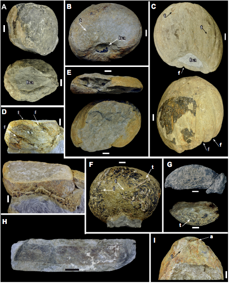 Description. Fruits partly preserved, laterally compressed; ovoid to planoconvex in shape; maximum preserved length 90–140mm, width 45–90mm, and thickness 20–45mm; exocarp and mesocarp poorly visible or not preserved; the upper part of the fruit is convex, or ends in an umbo of triangular shape, which is somewhat truncated and compressed, with a hollow centre (Fig. 4I); ridges up to three or not visible (Fig. 4I). Endocarps-entirely or partly preserved, compressed, generally with a truncated base; ovoid, globular, oblong, planoconvex or flattened in shape; maximum preserved length 86–112mm, width 76– 100mm, and thickness 30–65mm; basal aperture preserved or not visible, elliptical in cross section, maximum diameter 22–40mm (Fig. 4A, B, C); sulcus not visible; the surfaces of the endocarps are smooth or with deep longitudinal furrows running from the base to the apex (Fig. 4C, D); some of the endocarps display very fine longitudinal parallel striations (Fig. 4A).