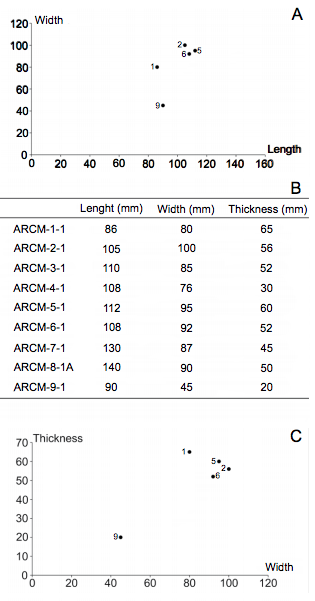 Material studied. ARCM-1-1; ARCM-2-1; ARCM3-1; ARCM-4-1; ARCM-5-1; ARCM-6-1; ARCM-7-1; ARCM-8-1A; ARCM-8-1B; ARCM-8-1C; ARCM-8-2; ARCM-9-1.