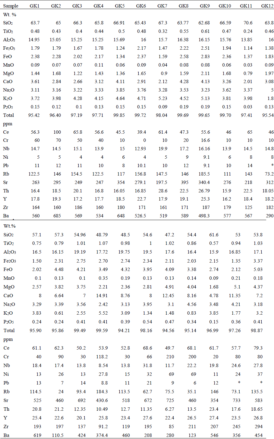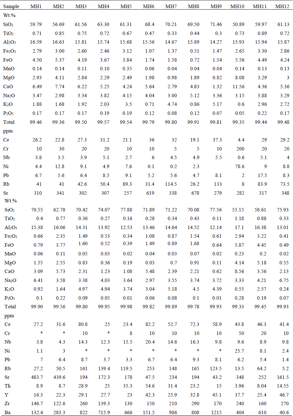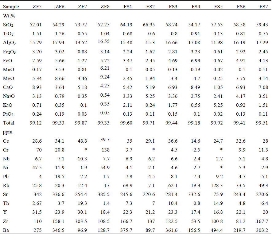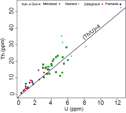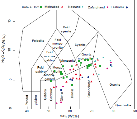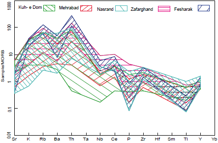 Sixty representative samples from the Kuh-e Dom, Mehrabad, Nasrand, Zafarghand, and Feshark were collected on the basis of their mineralogy, freshness, and geographic distribution. The selected samples were analyzed for major and trace elements. Major elements were analyzed by X-ray fluorescence (XRF) (Rigaku RIX 2000 with a Rh end window tube) using fused glass disks at Naruto University in Japan. Glass beads from finely grounded samples were prepared with a sample-to-flux (Li.B.O.) ratio of 1:10 and analyzed for major elements using fundamental parameter method spectrometry with analytical errors <1%.