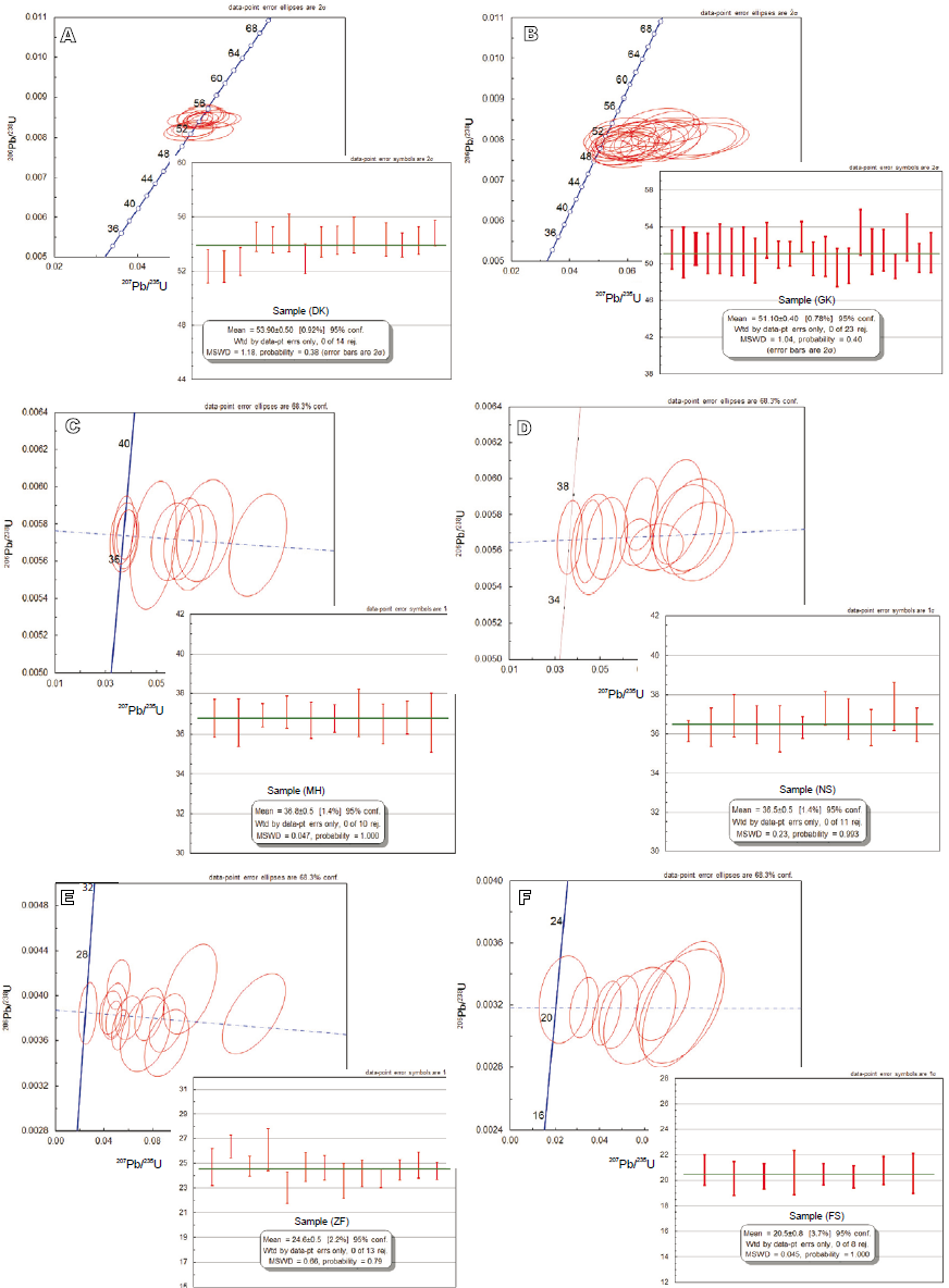 The results of calculating the isotopic age of the Kuh-e Dom granodiorite (GK), Kuh-e Dom diorite (DK), Mehrabad granodiorite (MH), Nasrand granodiorite (NS), Zafarghand granodiorite (ZF), and Feshark granodiorite (FS) are presented as concordia and average age graphics (Fig. 9) and the results are given in Table III. Therefore, the U-Pb zircon ages indicate that the Kuh-e Dom diorite and granodiorite were formed during the early to middle Eocene (Ypersian), the Mehrabad and Nasrand granodiorite during the late Eocene (Priabonian), the Zafarghand granodiorite during the late Oligocene (Chattian), and the Feshark granodiorite during the early Miocene (Burdigalian). Therefore, the plutonic rocks in the Ardestan magmatic segment reveal three main episodes of plutonic activity in the early-middle-late Eocene, late Oligocene, and early Miocene.