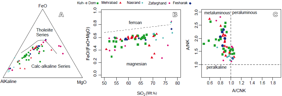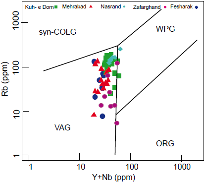 From a geochronological point of view, the Aredestan intrusive rocks are broadly similar to the other intrusive rocks in the UDMA spanning from 81.0 to 5.4Ma. This semi-continuously activity all along the UDMA can be related to the persistent subduction of the Neo-Tethys oceanic crust below the Iranian plate. The Kuh-e Dom, Mehrabad, Nasrand, and Zafarghand were emplaced during the Eocene-Oligocene epoch during the maximum magmatic activity. Another phase of plutonism in the Ardestan area was responsible for the emplacement of the Feshark intrusive rocks. Considering most of the researchers agree that the timing of the continental closure is Miocene (e.g. Dewey and Sengör, 1979; Robertson, 2000; McQuarrie et al., 2003; Mohajjel et al., 2003; Homke et al., 2004; Guest et al., 2006;Omrani et al., 2008; Ao et al., 2016). It seems that the Eocene-Oligocene intrusive rocks (i.e.Kuh-e Dom, Mehrabad, Nasrand, and Zafarghand) in the Ardestan area were emplaced prior to the collision, showing a pre-collisional volcanic arc setting, and that the younger intrusion (e.g. Feshark) was formed relatively late in the subduction history and may represent post-collisional plutonism.