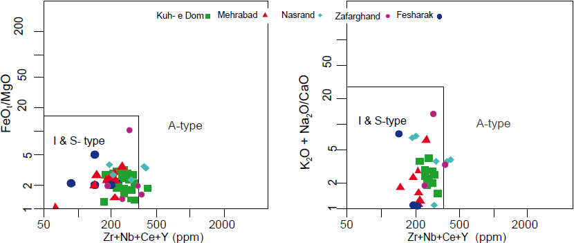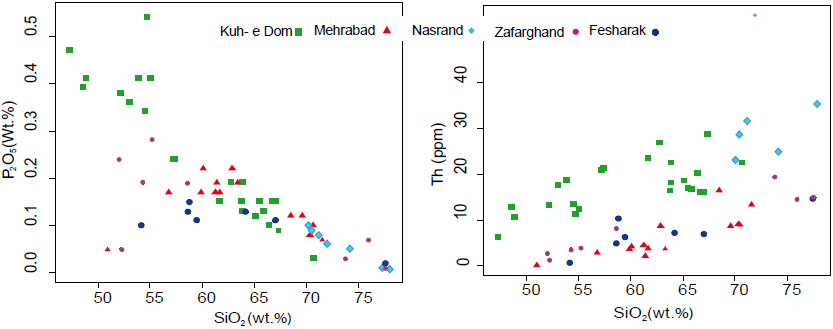 A discrimination plot of Zr+Ce+Y+Nb vs. (Na.O+K.O)/ CaO and FeOt/MgO (Whalen et al., 1987) shows that the studied samples plot within the field of I- and S-type intrusive rocks and are distinct from the A-type granites of alkali nature (Fig. 4). The sharply linear negative trend between P.O. and SiO. (Chappell, 1999) and sharply linear positive trend between Th and SiO. from the most mafic to the most felsic compositions (Chappell et al., 1998) can be considered typical of I-type granite (Fig. 5). The oxidized I-type geochemical signatures of these intrusive rocks are also supported by their mineralogy, i.e. predominance of biotite and hornblende as mafic silicates, and the abundance of euhedral titanite and magnetite as accessory phases (Chappell and White, 1974). Lack of muscovite and monazite minerals is typical of I-type intrusive rocks. Apatite inclusions are common in biotite and hornblende, as are expected for I-type intrusive rocks and occur in larger individual crystals in the S-type varieties. The wide range of modal distribution from gabbro to granite, indicates the studied samples are I-type granitoids.