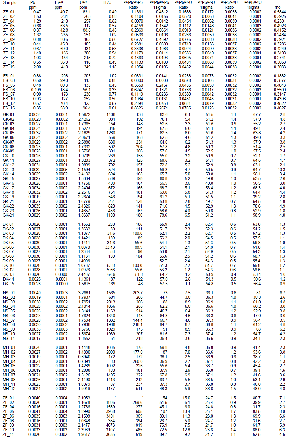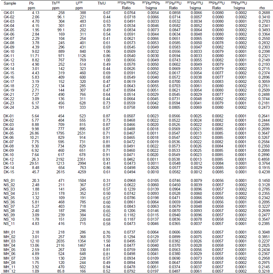 One diorite sample from Kuh-e Dom (DK), and five granodiorite samples from Kuh-e Dom (GK), Mehrabad (MH), Nasrand (NS), Zafarghand (ZF), and Feshark (FS) were selected for zircon U-Pb geochronology (see U-Pb data in Table II). Zircon is a common accessory mineral in the studied rocks and forms prismatic crystals with a maximum size close to 300μm. The zircon crystals are automorphic to sub-idiomorphic, and display a well- developed oscillatory zoning indicative of growth under magmatic conditions (Koschek, 1993; Gao et al., 2007). Zircon is a reliable recorder of magmatic conditions in which it grew, because of its resistance to isotopic resetting at magmatic conditions and its ubiquitous presence in silicic magmas. In a few samples the occurrence of xenocrystic cores can be observed. To determine the age of emplacement of the granites in these samples, analyses were mostly carried out on the external domains of the zircons grains with magmatic textures.