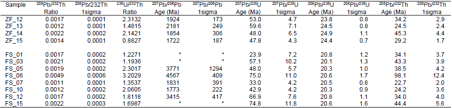 Zircon grains have variable Th and U concentrations (Table II). Generally, a zircon with a Th/U ratio larger than