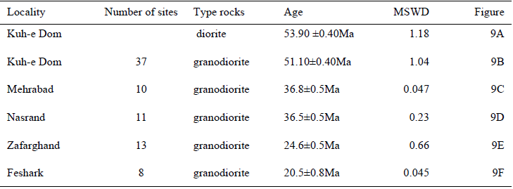 According to our U–Pb results, the granodiorite and diorite of the Kuh-e Dom intrusion were emplaced at 51- 54Ma, during the early-middle Eocene, which is slightly older than previous dating by K-Ar (Technoexport, 1981), which yielded late Eocene ages. According to field observations, the intrusive rocks of Mehrabad, Nasrand, Zafarghand, and Feshark, in the Ardestan area, are intruded into early Eocene volcanic rocks (andesite, dacite latite, and tuffs), thus indicating a post-early Eocene age, in agreement with an Oligo-Miocene age estimated earlier (e.g.Aghanabati, 2004). The new isotopic data provide a revised age for these intrusive rocks, from the late Eocene (Mehrabad and Nasrand), in contrast with the earlier views, to late Oligocene (Zafarghand), to early Miocene (Feshark). Therefore, the Tertiary plutonism in the Ardestan area can be divided into three main episodes; i) early-middle-late Eocene, ii) late Oligocene and iii) early Miocene intrusions, which have been considered central part of the UDMA plutonism. The intrusive rocks in the Ardestan area were emplaced from early Eocene to early Miocene plutonic interval and the Zafarghand and Feshark intrusive rocks, which are closer to the trench, are the younger intrusive units in the Ardestan area. It is apparent that the plutonism was more intense during the Eocene for the central part of the UDMA belt, as shown also by Berberian and Berberian (1981).