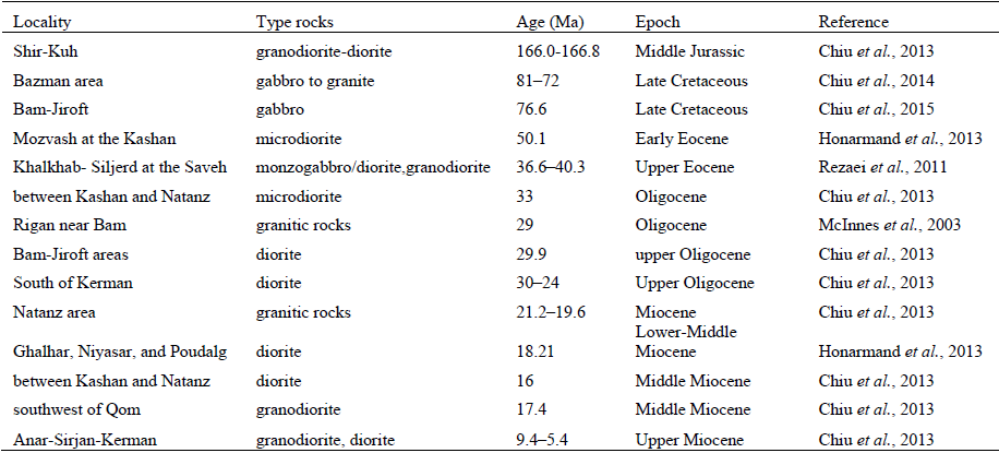 Chiu et al. (2013) suggested that magmatism in the UDMA was most active and widespread in the Eocene and Oligocene, and magmatic activity lasting from ca. 21 to 6Ma ending with small-volume intrusions. Cessation of arc magmatism took place progressively from the Northwest to the southeast. This southeastward termination of the UDMA magmatism is consistent with the notion of oblique and thus diachronous collision between Arabia and Eurasia, with the collision initiating in the Northwest and propagating progressively to the Southeast along the Zagros suture zone (see Chiu et al., 2013).