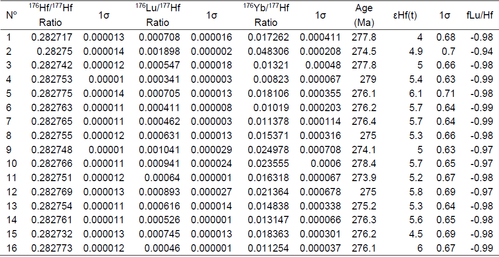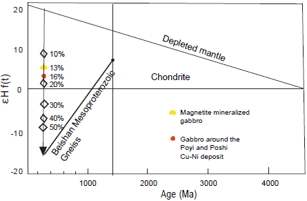 The Lu-Hf isotopes of the selected zircon crystals from the magnetite-mineralized gabbro are listed in Table II. The calculated εHf(t) values of these zircon crystals range from 4.0 to 6.1, and is 5.3 on average. While, the εHf(t) of the zircon crystals of the Pobei gabbro enclosing the Poyi and Poshi Cu-Ni deposit ranges from -0.8 to 5.3, with 3.2 on average (Su et al., 2011); thus, the magnetite-mineralized gabbro has a εHf(t) of zircon close to that of the Pobei gabbro around the Poyi and Poshi Cu-Ni deposits.