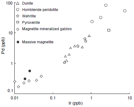 mantle-derived magma origin and evolution and the genesis of magmatic deposits (Qi et al., 2007; Lorand et al., 2008; Song et al., 2009). Ruthenium is a compatible element during crystallization evolution (Capobianco et al., 1994; Hill et al., 2000; Puchtel and Humayun, 2001; Righter et al., 2004) and thus will gradually be lost in the residual magma, magnetite-mineralized gabbro, and massive magnetite ores, which show a loss of Ru relative to dunite in the Poyi Cu-Ni ore deposits (Fig. 9), indicating that they may be later products compared to the Poyi ultramafic rocks (dunite). During the crystallization of the silicate minerals, Ir is compatible, while Pd is incompatible (Capobianco et al., 1994; Hill et al., 2000; Puchtel and Humayun, 2001; Righter et al., 2004). Therefore, along with the crystallization of olivine, chromite, and pyroxene, the Ir content will decrease, whereas the Pd content will increase in the residual phase, causing an increase in the Pd/Ir ratio. Therefore, the more complete the magma evolution is, the greater is the Pd/ Ir. However, the Pd/Ir ratio can also be influenced by the sulfide fractional crystallization. Experimental studies indicate that the first phase to crystallize from a sulfide melt is a monosulfide solid solution (Mss; Naldrett et al., 1967; Kullerud et al., 1969; Misra and Flet, 1973, 1974). The Mss/sulfide liquid partition coefficient of Ir is 3.4–11, and that of Pd is 0.09–0.2 (Fleet et al., 1993; Barnes et al., 1997). If Ir were compatible during the fractionation of Mss in the rocks, Ir would show a negative correlation with Pd in the whole rock (Song et al., 2008). It is clear that Ir has a positive relationship with Pd in the Pobei area (Fig. 11), indicating that the Mss fractional crystallization was weak in Pobei. Therefore, the Pd/Ir values of the Pobei mafic-ultramafic rocks are mainly influenced by the crystallization of silicate minerals. The Pd/Ir values of dunite without sulfide, the lithofacies containing sulfide (including hornblende-peridotite, wehrlite, and pyroxenite) in the Poyi Cu-Ni deposit, magnetite-mineralized gabbro, and massive magnetite ores are 8.19, 12.18, 12.26, and 18.14, respectively. This finding indicates that the massive magnetite was probably the latest product in the evolution of the Pobei mafic- ultramafic intrusions, as the more complete the magma evolution is, the greater is the Pd/Ir.