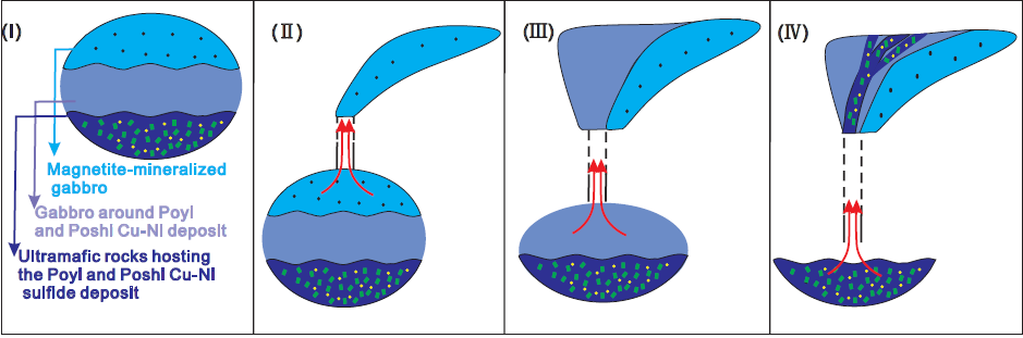 Based on all the evidence, we think that the magnetite-mineralized gabbro was a late product during crystallization differentiation compared to Pobei ultramafic rocks, but field evidence shows that the former was emplaced earlier. Hence, the question is, what happened? We infer that the magma differentiation occurred in a deep staging magma chamber. The olivine crystals sank to the bottom of the magma chamber, leaving the less mafic residual magma in the upper part of the chamber (Fig. 12I). At the late stage, the magma became iron enriched through crystallization differentiation. The ultramafic rocks hosting the Poyi and Poshi Cu-Ni sulfide deposits belong to the lower part of the magma chamber, while the magnetite-mineralized gabbro is located in the upper part (Fig. 12I). The magnetite-mineralized gabbro in the upper part of the deep chamber was injected first into the upper chamber (Fig. 12II). The earlier crystallized heavy olivine and some interstitial sulfides were at the bottom of the staging magma chamber and thus were emplaced last (Fig. 12IV), forming the intrusive ultramafic bodies.