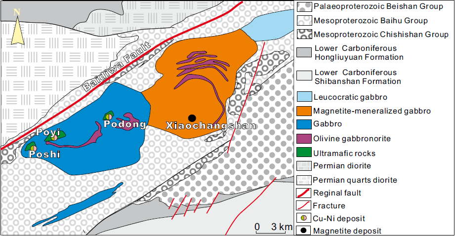 Keywords:Magmatic Cu-Ni sulfide depositMagmatic Cu-Ni sulfide deposit,Xiaochangshan Fe depositXiaochangshan Fe deposit,Crystallization differentiationCrystallization differentiation,Magnetite-mineralized gabbroMagnetite-mineralized gabbro,BeishanBeishan.