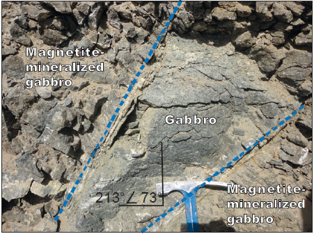 The Pobei complex is mainly composed of three mafic intrusions: gabbro, magnetite-mineralized gabbro, and leucocratic gabbro, from southwest to northeast (Fig. 2). The wall rock of the Poshi, Poyi, and Podong ultramafic rocks which host the Cu-Ni ore, comprises gabbro intrusions; the Xiaochangshan Fe deposit outcrops in the southern part of the magnetite-mineralized gabbro intrusion (Fig. 2). In the field, the gabbro cross-cutting the magnetite-mineralized gabbro (Fig. 3) indicates that the gabbro intrusion around the Poyi and Poshi Cu-Ni deposits was emplaced later than the magnetite-mineralized gabbro.