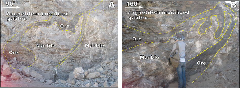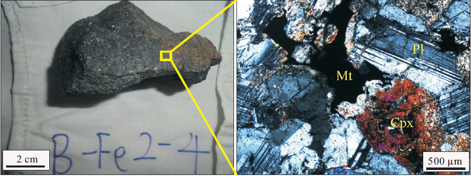 The magnetite-mineralized gabbro is black (Fig. 4). Clinopyroxene (Cpx) accounts for 35%–40% and is euhedral to subhedral, with a particle size of approximately 0.5x1mm; plagioclase (Pl) accounts for 50%–55% and is euhedral to subhedral, with a particle size of approximately 0.5x1mm; and accounting for 2%–4% magnetite (Mt) also exists in intergranular clinopyroxene and plagioclase (Fig. 4); therefore, Mt crystallized later than Cpx and Pl. The body of the Xiaochangshan magnetite ore is mainly located around the contact of the magnetite-mineralized gabbro and marble (Fig. 5). The ore mineral is magnetite, and ilmenite is rare.