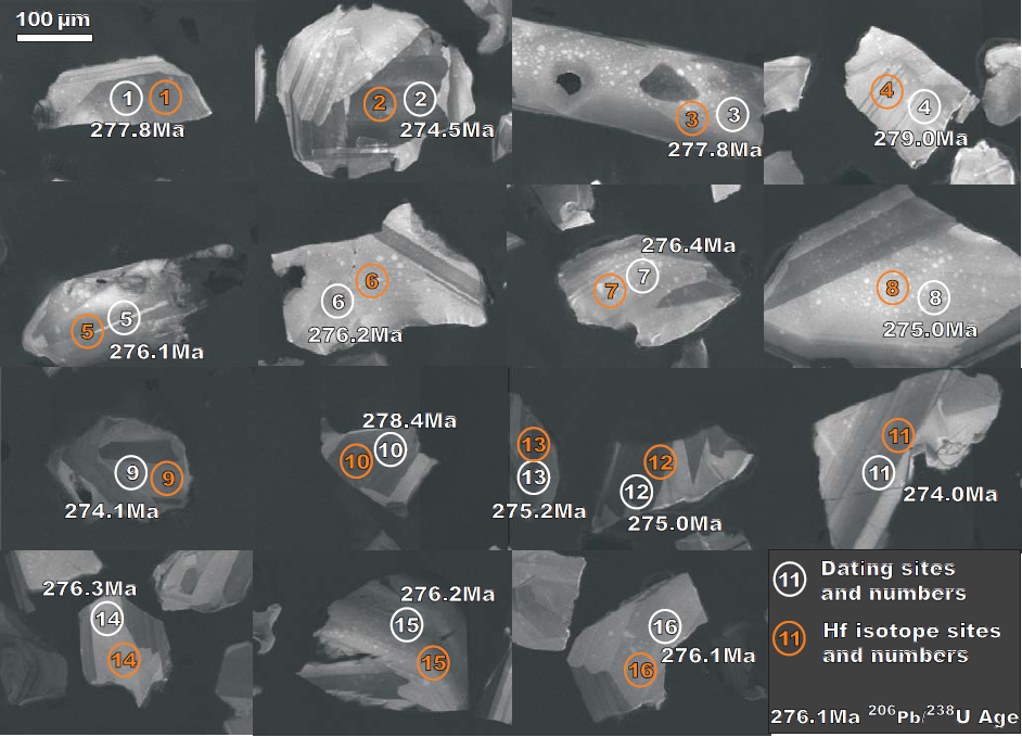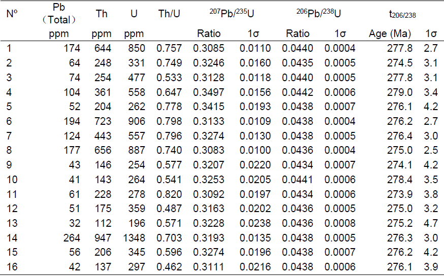 The U-Pb age of the magnetite-mineralized gabbro is 276±1.7Ma (n=16, MSWD=0.2; Fig. 7). The U-Pb ages of the zircon crystals separated from the gabbro intrusions, which formed the wallrock of the Poshi, Poyi, and Podong ultramafic rocks, where the Cu-Ni ores exist, are 274±4 and 278±2Ma (Jiang et al., 2006; Li et al., 2006c). The fact that these two types of rock show the same age indicates that the rocks hosting the Cu-Ni and magnetite ore deposits probably originated from the same parental magma.