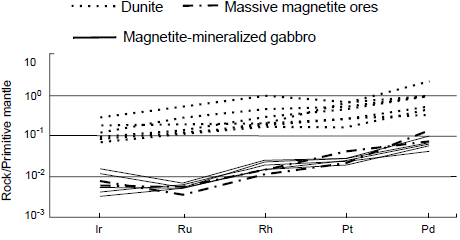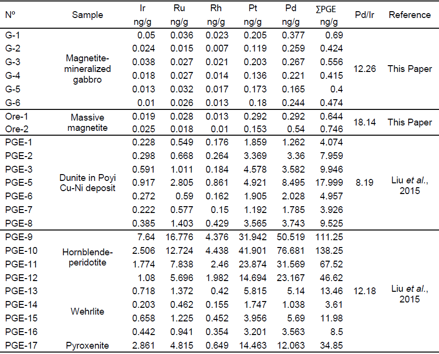The platinum group elements (PGEs) concentrations in 6 magnetite-mineralized gabbro samples and 2 Massive magnetite samples were determined at the Institute of Geochemistry of the State Key Laboratory of Ore Deposit Geochemistry in Guiyang, China, by Inductively Coupled Plasma-Mass Spectrometry (ICP-MS) coupled with a modified Carius tube isotope dilution method (Qi et al., 2007).