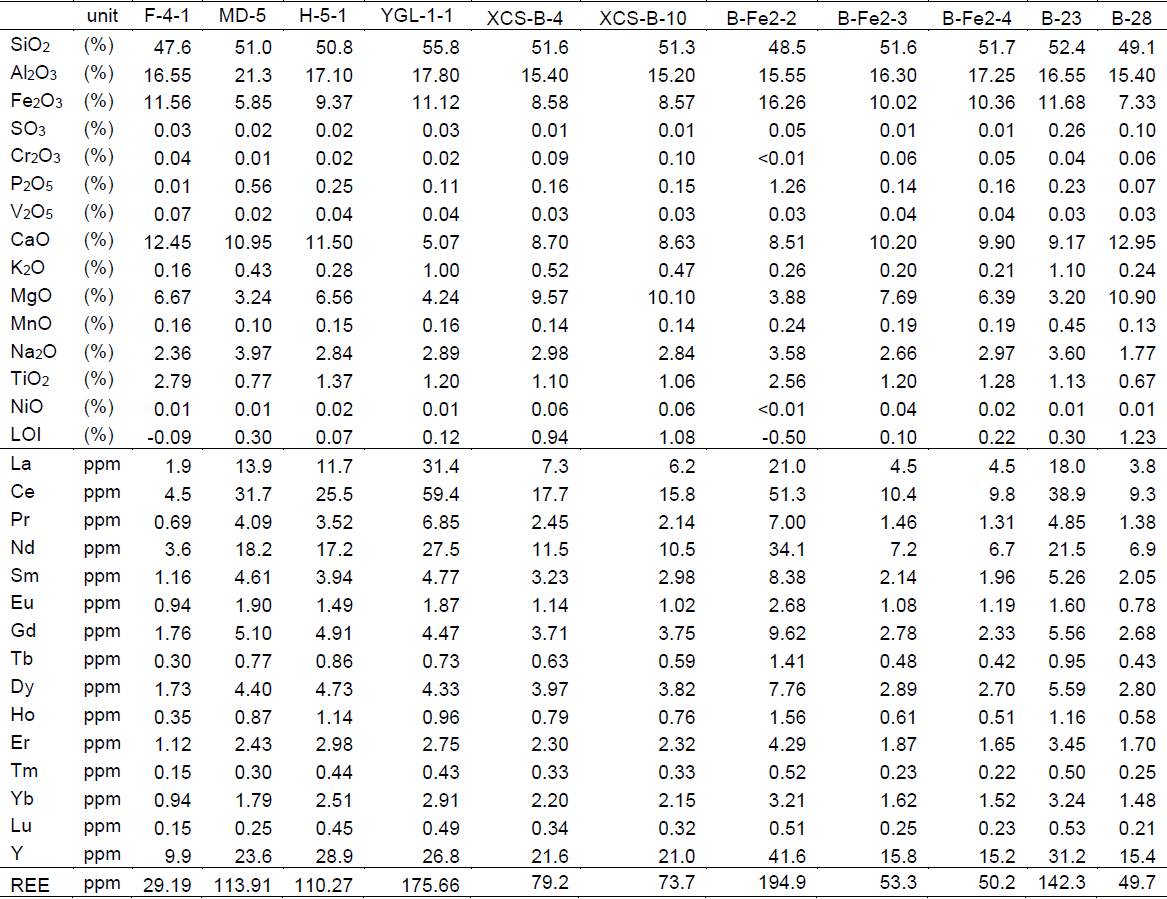 Major and rare elements of 11 magnetite-mineralized gabbro smaples were analyzed at ALS Chemex (Guangzhou) Co. Ltd using ME-XRF26 and ME-MS81 methods, respectively. The analysis method for the loss of ignition was ME-GRA05.