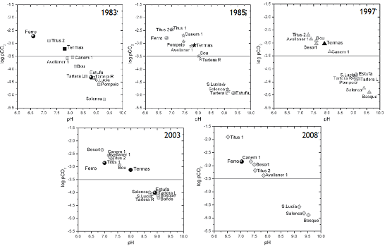 The fact that the pH values do not fit exactly on the theoretical mixing line indicates that still some additional process must be considered. As described above, CO2 partial pressure (pCO2) calculated for these waters range from logpCO2= -5.2 (Salenca in the sampling campaign of 1983) to logpCO2= -1.90 (Titus 1, in 2008) (see Figure 8 and Tables II to V), and it is expected that waters with low CO2 partial pressure will tend to equilibrate with the atmosphere or the soil system (to incorporate CO2 and therefore, to decrease pH) when they reach surface. This CO2 input can occur in the hot water or after its mixing with some proportion of cold waters. The clearest example shown in Asta et al. (2010), and confirmed for the rest of the sampling campaigns, corresponds to Estufa. The pCO2 value in the thermal end-member Estufa is in clear disequilibrium with the atmosphere, while is close to equilibrium in Termas (Fig. 8). This suggests that Termas, although originally could have had a value similar to Estufa, has experienced the addition of atmospheric/soil CO2. This CO2 input to the Termas thermal water would be responsible for its pH decrease, in contrast to the constant pH of Estufa, which is unaffected by additional CO2 input. Other possible processes affecting the pH value, such as calcite dissolution/precipitation reactions, are not probable (see further details in Asta et al., 2010).