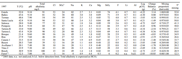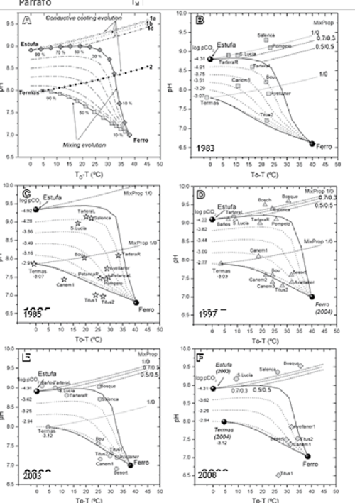 Following the procedure described in Asta et al. (2010), simulation of the different secondary processes affecting the system has been performed with PHREEQC (Parkhurst and Appelo, 1999). The simulations include the pH evolution along three processes: mixing, cooling and CO2 exchange and finally their superposition. The data used as end-members correspond to each sampling campaign, except for the case of the 1997 sampling, when the cold end-member used corresponds to Ferro data of 2003 or in the case of 2008 campaign when the hot end members, Estufa and Termas, were not sampled and the data from the 2003 campaign have been used instead.