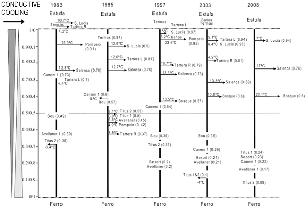 The hot and cold end members (Estufa and Ferro, respectively) are relatively constant in temperature and pH over time and have been considered as not affected by the secondary processes. The rest of the spring waters, however, are affected by mixing, conductive cooling and CO2 input to different extent (Fig. 10). The study of these processes over time has shown some interesting behaviours that have helped to understand the external factors on the physico-chemical characters of this geothermal system.