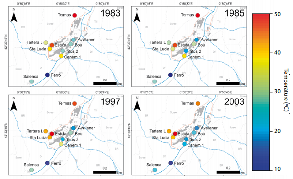 A considerable part of the appeal of many spas rests in the springs’ status as natural phenomena (Atkinson and Davison, 2002) and its maintenance requires a sustainable use of the thermal water preserving the water temperature and the water quality in order to be used for balneotherapy practices. To identify potential threats to the water quality of Caldes de Boí thermal waters over time (e.g. mixing with superficial cold waters) data over more than 20 years have been collected and a classical and simple geochemical methodology similar to that presented by Auqué (1993) and Asta et al. (2010) has been applied. This methodology allows evaluating the effect of the aforementioned secondary processes on the chemistry and temperature of the thermal waters by using different ion-ion plots and geochemical modelling calculations. Furthermore, the geochemical calculations presented here are useful to evaluate the potential precipitation of mineral in the spa installations, which could cause high costs; and to adopt suitable actions to mitigate it. Therefore, the aims of this research are: i) to evaluate the potential effect of additional factors (such as the seasonal climate and the spring geomorphological setting) in the changes observed in the hydrochemistry of the different thermal waters with time; ii) to assess their influence on the thermal waters modifying their composition and temperature, affecting to their quality for balneotherapy and causing mineral scaling; and iii) to propose monitoring practices to maintain the sustainability of the spa resort. With these objectives, reported data of IGME (1984), ENHER (1985), Buil et al. (2002), Asta et al. (2010) together with the data corresponding to a sampling campaign carried out by the authors of this paper in 2008, were studied.