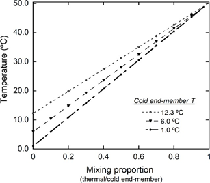The impact of the cold end-member temperature during the mixing process was tested decreasing the temperature of the cold end-member from 12.3ºC to 1ºC similar to summer and winter temperatures, respectively. The results show no dramatic differences between the mixing using this set of temperatures (see Fig. 12). In general, mixing cold water fractions of 0.6 or more (corresponding to thermal/non-thermal water ratios of 0-0.4) would decrease the thermal water T to values lower than 20ºC. In addition to that, the introduction and mixing of oxygenated cold water could quickly oxidize the sulphide present in the water and dilute the concentrations of other components that provide the water their balneotherapeutic properties (e.g. silica, sodium, chloride). This indicates that thermal/ non-thermal mixing ratios lower than 0.4 would threaten the thermal water quality for the spa purposes.