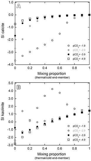 In contrast to the calcite results, kaolinite saturation indices are affected by increasing and decreasing the pCO2 and their consequent pH variations (Fig. 13B). The presence of kaolinite precipitates have been detected in springs of other alkaline thermal waters in the Pyrenees (e.g. Boulègue et al., 1981; Couturier et al., 1984) and the obtained results would suggest the possible precipitation of this mineral phase during mixing processes with a high pCO2 cold end-member (Fig. 13B). The importance and implications of this precipitation process would need further studies.
