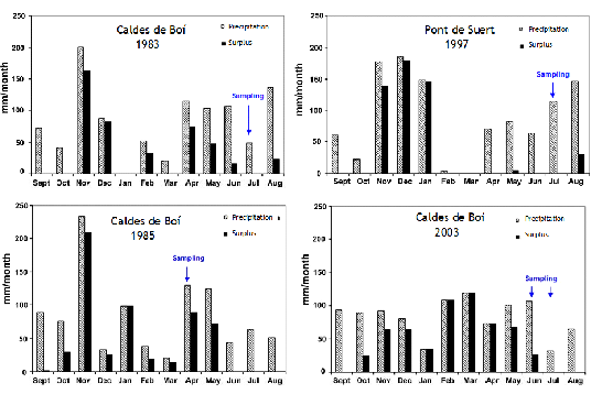 The results shown in Figure 11 indicate that the 1983 and 1997 sampling campaigns were carried out during relatively arid conditions without soil water surplus. In contrast, the 1985 sampling clearly corresponds to a period of elevated precipitation with water surplus and with a remarkable water surplus in the soil in the months previous to this sampling.