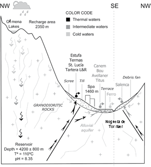 The most striking structural feature of La Maladeta massif related to the geothermal springs is its dense fracture network. Apart from the Noguera-Ribagorzana milonite zone that divides the plutonic complex into the two units, there is an important number of fractures and shear zones affecting La Maladeta massif. These fracture systems enhance the subsurface permeability and exert a great influence on the development of this geothermal system. The fractures are mainly related to the Alpine orogeny and show preferred orientations NE-SW and NW-SE (see Fig. 1). This intense network favours a slow deep infiltration of the water through continuous vertical fractures enhancing the development of the geothermal system and acting as the main water flow paths (Fig. 2). The recharge area corresponds to the region of the Gémena lakes, at 2,350m of altitude, and it is located close (at a distance of 3 to 4km) to the emerging zone (Buil et al., 2002). The reservoir is thought to be very deep, around 4,200m, calculated from the temperature at depth obtained by geothermometrical methods and the geothermal gradient of the area (Auqué, 1993; Buil et al., 2002). The residence time of the thermal waters was calculated to be very long (about 16,000 years based on the 14C data; Buil et al., 2002, 2006). The circuit is thought to be U-shaped (Fig. 2) due to the short separation between recharge and discharge areas (3–4km) and to the great depth of the reservoir (4km below the recharge area level). This feature has also been described for other thermal systems in the Pyrenees (e.g.Luchon, Chevalier-Lemire et al., 1990; Cauterets, Soulé, 1990) and in other granitic geothermal systems (e.g. Druschel and Rosenberg, 2001).