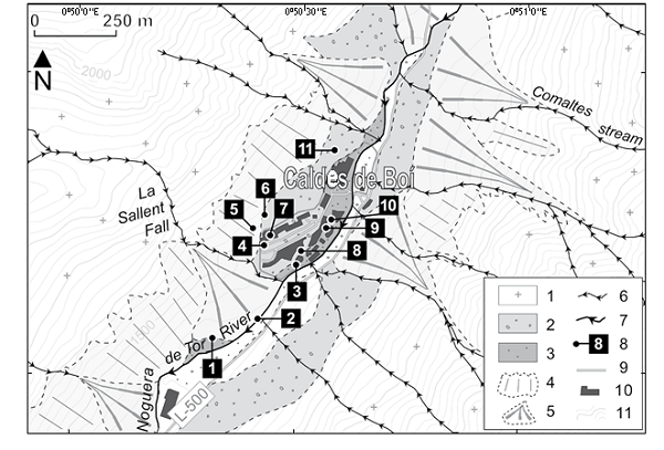 Salenca, in the lowest part of a debris fan close to the riverbed, shows intermediate features that do not change over time. This suggests that Salenca is not influenced by the shallow aquifer hosted in the alluvial deposits of the Noguera de Tor River and its geochemistry may be influenced by a slightly different flow path followed by the deep geothermal waters.