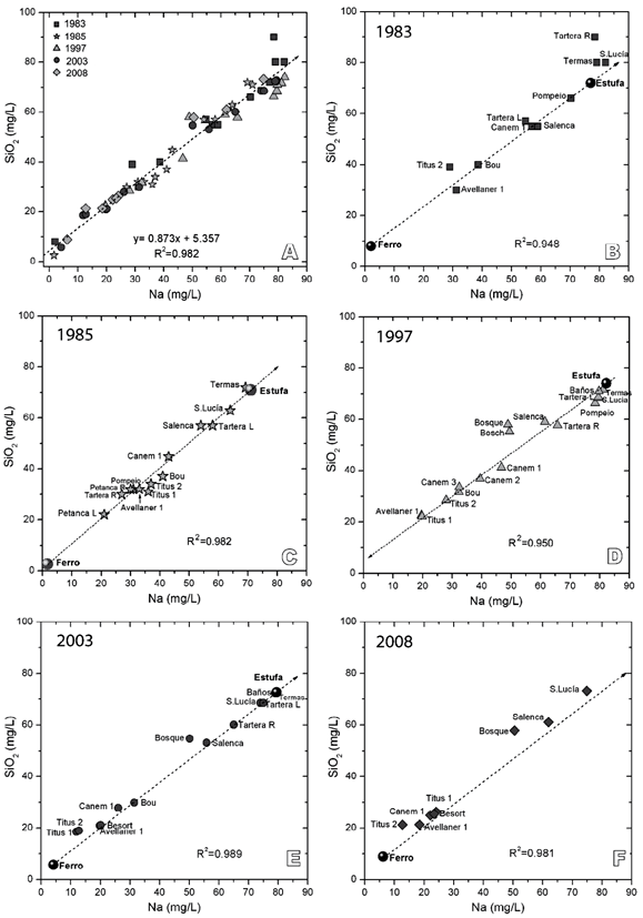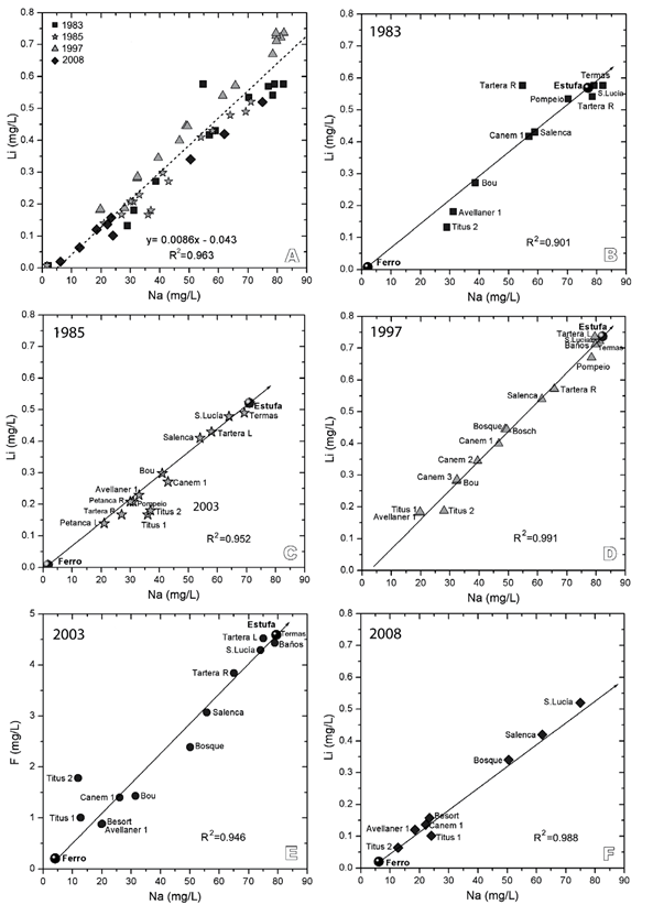 Figures 4 and 5 present several ion-ion plots in which, as in earlier studies (cf Criaud and Vuataz, 1984; Auqué, 1993; Chae et al., 2006; Asta et al., 2010, 2012; Han et al., 2010), sodium has been selected as the main conservative geothermal tracer in this system. A very good correlation is shown between conservative geothermal tracers for this system including SiO2, F, Li and Na. This suggests a mixing process between two end-members with different chemical characteristics and corresponding to a thermal end-member (represented by Estufa, Termas and Baños springs) and a cold end-member (represented by Ferro spring). This mixing relationship appears to be time invariant. The mixing fraction for each spring can be calculated by its position on the mixing line (see Tables II to V in the Electronic Appendix). Although this mixing process occurs throughout the time, the mixing proportion can be different at different springs. This will be analysed below.