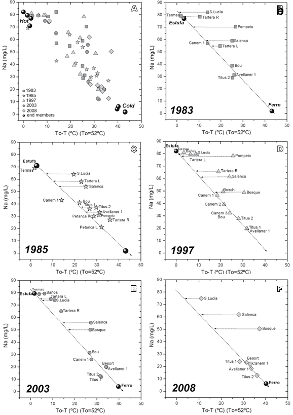 The presence of secondary processes has also been checked by analysing the relationship between the concentration of sodium (as the conservative element in this case) and other key physico-chemical parameters such as temperature and pH. Figure 6 shows the evolution of sodium concentration with the cooling intensity. Formally, the cooling intensity can be expressed in terms of enthalpy following the approach by Fournier (1979). However, in the temperature range of interest (below 50ºC), there are not meaningful differences between temperature and enthalpy and, thus, the cooling intensity has been expressed as the difference between the maximum temperature in the thermal end-member, T0, and the emergence spring temperature, T, in each sampling campaign (from zero for the thermal end-member (Estufa spring) to almost 40ºC for the cold end-member (Ferro spring)).