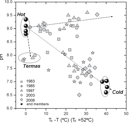 already reported by Asta et al. (2010), when the hot water dominates the mixing proportion, the conductive cooling effect on pH may be undistinguishable from the cooling effects due to mixing (see for example in Figure 9, Tartera L in the 1997 and 2003 samplings). This is because the pH variation is very small at the beginning of both processes. When the proportion of cold water increases in the mixing, the pH decrease dominates over the opposite trend of pH increase due to conductive cooling. This effect is also seen when the hot end-member is a less alkaline water (Termas spring), and the buffering effect of pH during mixing is much lower. In that case the effect of decreasing the pH due to mixing is higher.