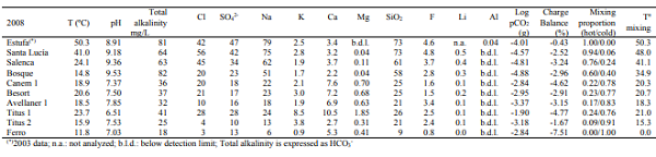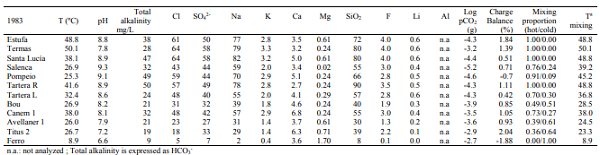 Other springs such as Tartera R and Tartera L show also high temporal variability with respect to their pH and temperature. This variability is determined by the different processes and by their different intensity. For example, Tartera R shows features very similar to the thermal end- member in 1983, though with lower temperature, suggesting the effect of conductive cooling. In 1985, this spring is influenced by mixing and CO2 addition. And, finally, in 1997 and 2003 the spring shows the effect of all these processes. In the case of Tartera L, it experienced mixing, conductive cooling and CO2 addition in 1983 and 1985, whereas in 1997 the conductive cooling is the only process that plays and important role (displaying similar composition to the thermal end-member). Finally, in 2003, conductive cooling and mixing take place as the main processes.