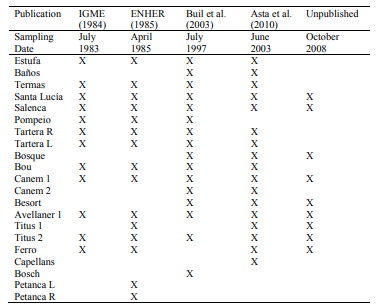 Data compiled by the Spanish Geological Survey (IGME, 1984), by a local hydroelectric company (ENHER, 1985), by Buil et al. (2002), by Asta et al. (2010) and unpublished data from a 2008 geochemical sampling field campaign, were used in this study (see Water pH and temperature were measured in the field and the water samples were taken in HCl-pre-washed polyethylene bottles rinsed, afterwards, three times with double-distilled water. Polyethylene bottles of 1,000ml were used for anions and 100ml bottles for cations analysis. Samples for cations were filtered through 0.1μm (MILLIPORE filters previously cleaned with ultra pure nitric acid) and then preserved with HNO3 to pH less than 2. Water pH was measured using two different portable pH-meters with automatic temperature correction, an ORION 250A and an ORION 8155SC. One calibrated with pH buffers, 4.0 and 7.0, and the other with pH buffers 7.0 and 10.0. Temperature was measured with the probe connected with the pH-meter. The estimated measurement errors for pH and temperature were ≤0.03pH unit and ±0.5ºC, respectively.