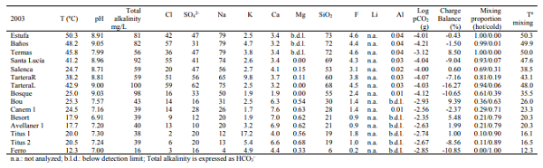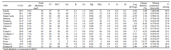 Salenca spring is affected by mixing with similar proportions of the thermal and cold end members (from 0.7/0.3 to 0.8/0.2) and the conductive cooling affects the spring waters in a similar degree in all campaigns (from 12.3ºC to 17ºC of conductive cooling). Only in the 1985 and 2003 samplings Salenca spring water is also influenced by CO2 addition, which could explain the lowest pH values found in those samples. This input of CO2 to the solution could come from the soil or biogenic processes, however, some CO2 addition from the atmosphere during the sampling cannot be ruled out.