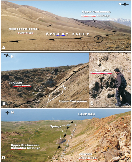 the same units (Fig. 3). Southern branch can clearly be followed by lithological borders and the alignment of water springs (Fig. 4D). The connection of the southern branch with eastern part of the Özyurt thrust fault is a NE–SW trending sinistral strike-slip fault near the Güvençli village (Fig. 5). The southern branch deforms the semi-consolidated, gravelly shore deposits of the Lake Van (Fig. 6A). Movement of the fault blocks caused re-orientation of pebbles along longitudinal axes in the fault zone (Fig. 6B). Prolongation of the branches cannot be observed to the west as the faults enter the Lake Van.