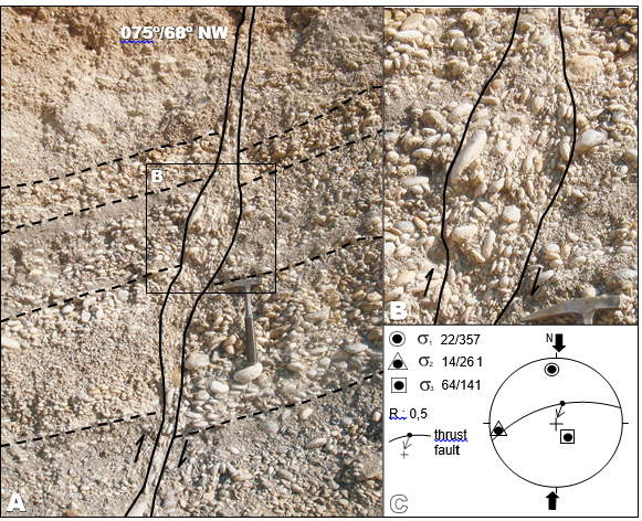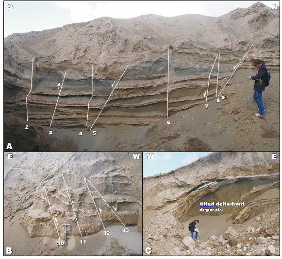 West wall of the quarry presents different faults with similar strikes. Thrust faults (# 10, 11, 12) and a normal fault (# 13) were determined in sandy and silty lacustrine deposits (Fig. 8B). Thin bedded, sandy delta-front deposits at the southern part of the quarry have high inclinations (68º) (Fig. 8C). These dip values higher than original depositional conditions (angle of rest) result from the deformation by faults on the lacustrine and shore deposits.