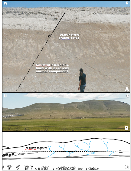 Alignment of the water springs and shifted drainage pattern are the morphological features of this zone (Fig. 7B-C). Bending zones of the Karasu river channel and the Alaköy thrust fault is located on the Yeşilköy segment (Fig. 3).