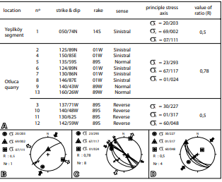 Results of the analysis indicate three different deformation mechanisms. First data measured from Yeşilköy segment (# 1) (Fig. 9A). At this location the σ2 is nearly vertical and according to R values (R=0.5), the type of deformation is pure strike-slip (sinistral) stress regime (Delvaux et al., 1997) (Fig. 9B).