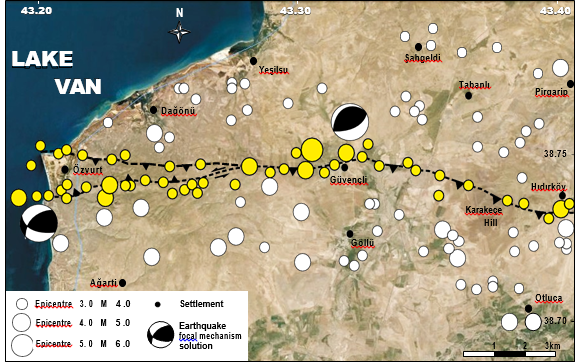 Van-Tabanlı Earthquake (October 23rd, 2011) is the largest seismic event originated from a thrust fault in Turkey (Koçyiğit, 2013). The epicentre of the earthquake was located about 25km northeast of Van city centre. It caused 604 death and damage. Thousands of aftershocks occurred within a closer area.