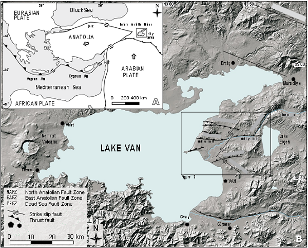 A) Major neotectonic features of Turkey and adjacent areas (white arrows indicate the motion of the plates), B) location map showing active faults on eastern part of Lake Van Basin.