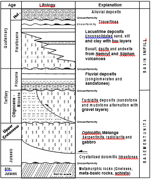 Basement units are unconformably overlain by Pliocene fluvial deposits, Quaternary volcanics and lacustrine sediments younger than 600kyr (Stockhecke et al., 2014). The basin infill ends with Late Quaternary travertine and recent unconsolidated fluvial sediments (Acarlar et al., 1991; Senel, 2008) (Fig. 2).
