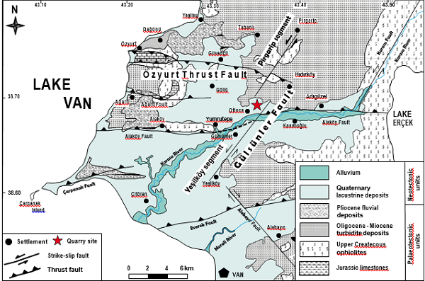 Otluca quarry was excavated on the transfer zone of the two segments of Gülsünler fault (Fig. 3). The stratigraphic succession in the quarry is mainly composed of sandy and gravelly lacustrine and shore deposits of Lake Van.