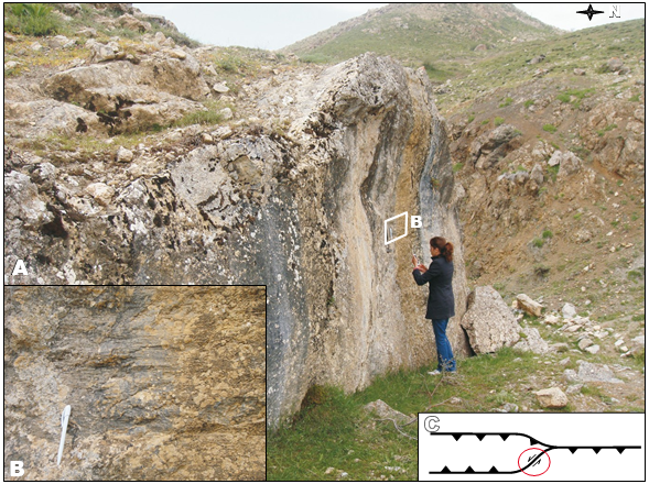 The western part of the Özyurt fault bifurcates into north and south branches to the west of Güvençli village. Southerly-dipping northern branch is 5km long which juxtaposes the Upper Cretaceous ophiolitic mélange units and Jurassic limestones (Fig. 4B-C). Northerly- dipping southern branch is 6km long which separates