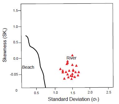 Friedman (1961) proposed that dune, beach and river sands could be differentiated by movement parameters which he interpreted to reflect differences in the mode and energy of sediment transport. He concluded that the movement parameters are more sensitive to differences in grain-size distributions than the ones corresponding to graphical parameters. However, plots of graphical parameters, median versus standard deviation (σ1) (Fig. 8) and standard deviation (σ1) versus skewness (SKI) (Fig. 9) are confined to the field of beach and river sands. Beach sands are more prominent according to the plots of Friedman and Moiola and Weiser (Fig. 5). However, when the data are plotted in the diagram of Friedman and Sanders (1978) most of the samples cluster in the river sand zone (Fig. 9).