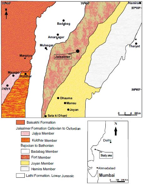 The Jaisalmer Formation is represented by alternating siltstones/sandstones and limestones and bioturbated and cross-bedded sandstones. Local erosional surfaces, lateral changes in lithology and repetitions of sedimentary facies are common features limiting the potential of intra basinal stratigraphic correlations. The sandstones of the Lathi and Jaisalmer formations come from the hinterland in the North and northeast, from where the sediments were transported by the fluvial system draining the western Rajasthan shelf, and deposited in a shallow marine setting in the Jaisalmer Basin. According to Kachhara and Jodhawat (1981) and Pandey et al. (2012b), the Jaisalmer Formation comprises six members: Hamira, Joyan, Fort, Badabag, Kuldhar and Jajiya in ascending order of superposition (Table 1).