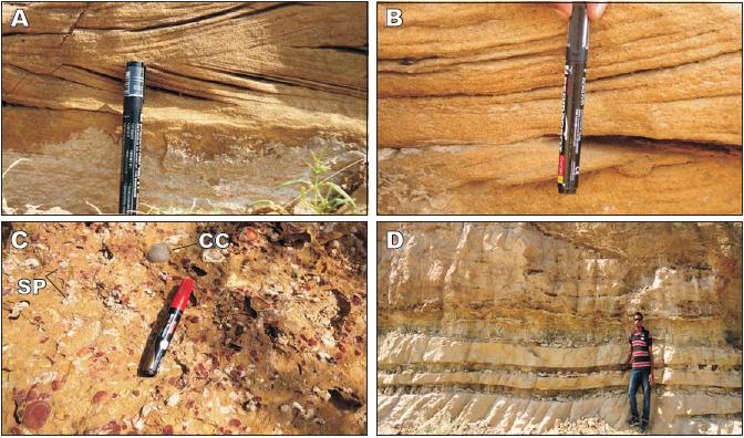 Field photographs showing A) cross-bedding in 1.5m thick medium to coarse-grained sandstones, B) moderately well sorted, medium to coarse-grained planar cross-bedded sandstones with an average bedding thickness of 7cm, C) matrix supported rounded to sub-rounded (moderately spherical) conglomerate clasts (CC) of 1-4cm, where the matrix is mainly composed of coarse sand and granules of quartz veins at the base, and fine to medium-grained sand at the upper part of the section, this matrix supported bed also has shale pebbles (SP) that are irregular to oval to rounded in shape, from 1mm-40mm in size, D) interbedded shales within the thinly bedded fine- grained sandstones, interbedded reddish white shales are of variable thickness, E) asymmetrical ripple marks with ripple wavelength range from 6cm to 12cm, F) symmetrical ripple mark, G) tabular and rippled top mud cracks, H) horizontal lamination in 2m thick whitish-brown sandstone beds.